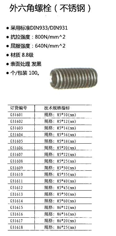 不锈钢外六角螺栓